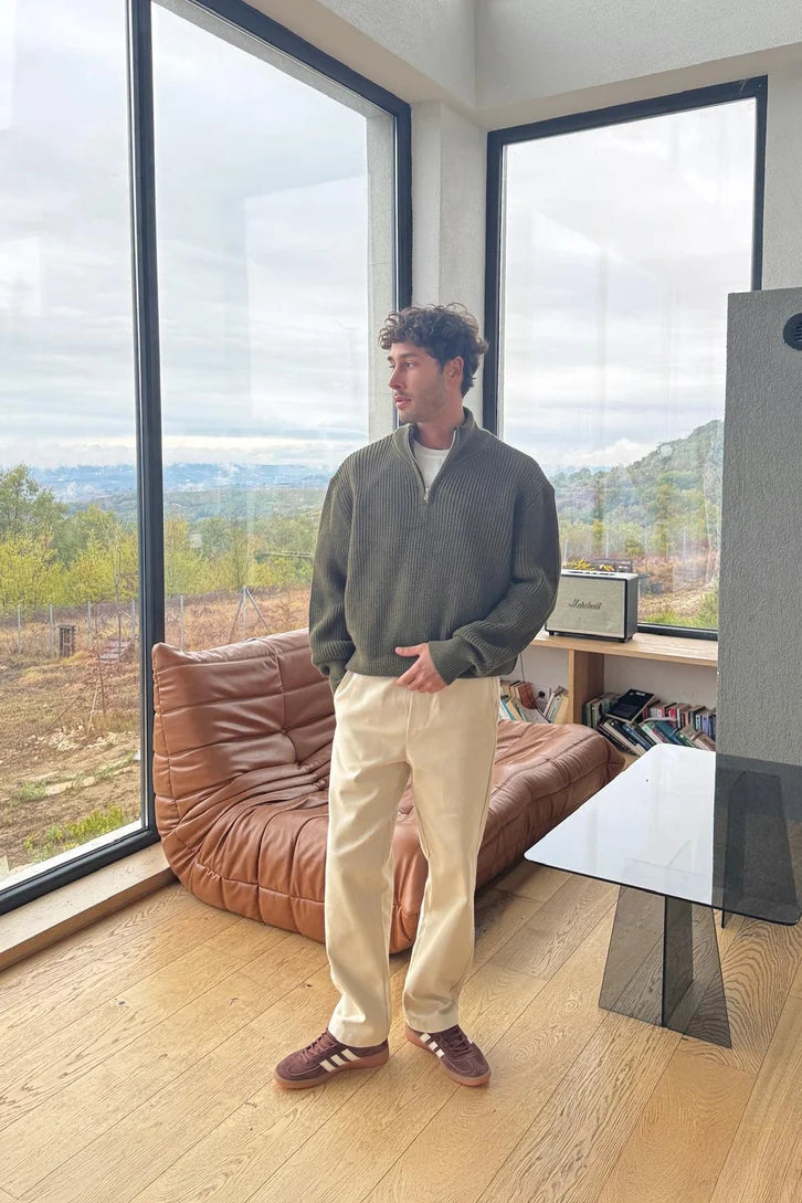 Introducing our A premium heavyweight Half-Zip Knit Sweater designed for warmth, comfort, and everyday winter style. Features a soft textured knit, relaxed fit, and a clean modern zipper collar. Perfect for layering and easy to style with any outfit.